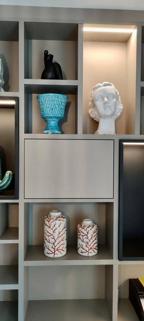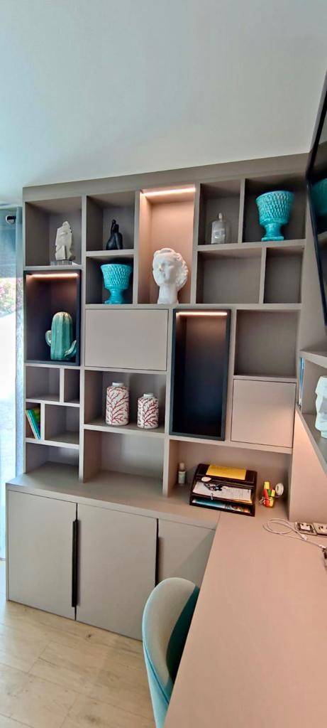 La partie basse du bureau est fermée pour y ranger tout ce que l’on ne souhaite pas voir et certaines niches de la bibliothèque sont également fermées pour apporter un contraste et du mouvement supplémentaire. Il y a aussi différentes profondeurs ce qui allège visuellement cet aménagement.
