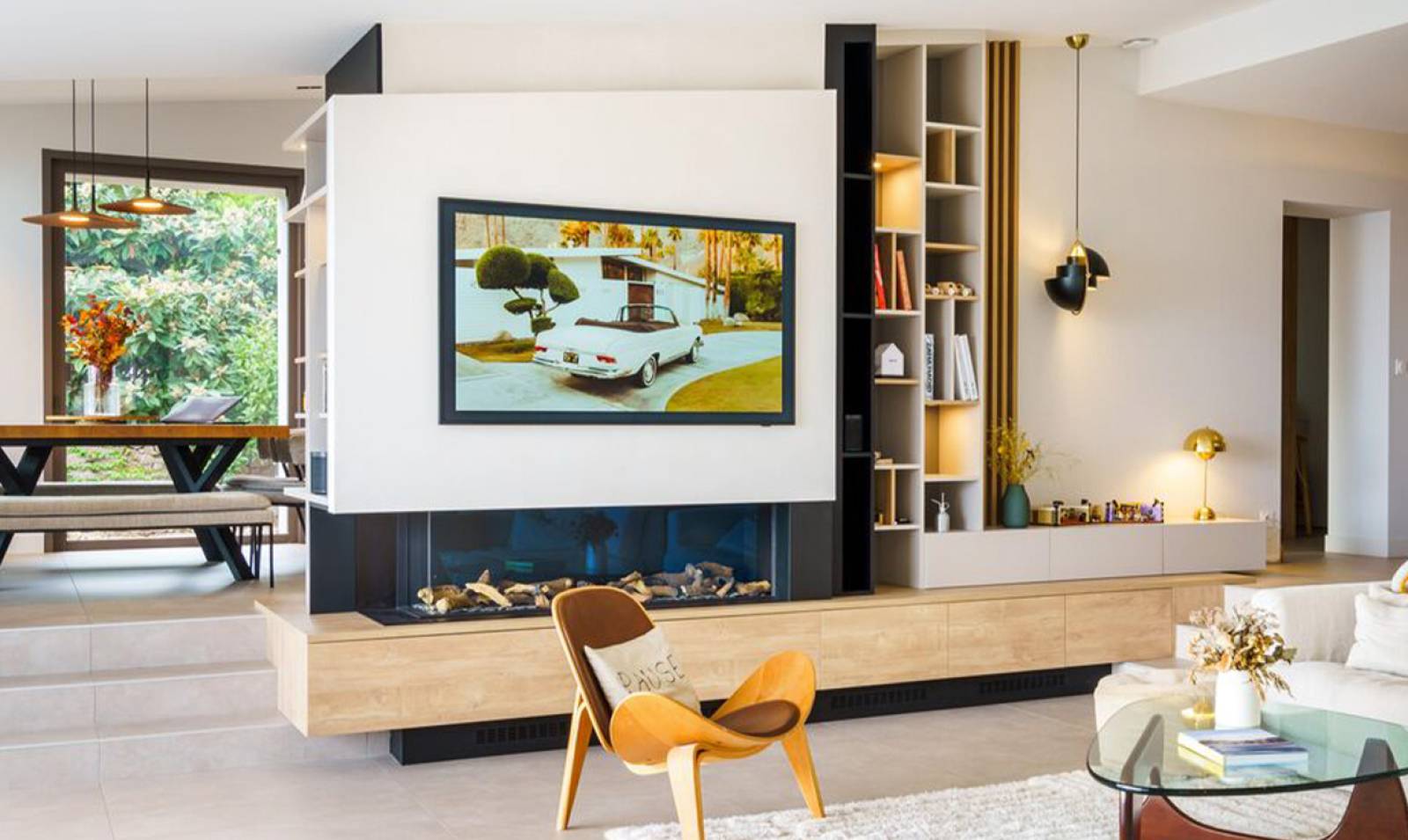 Un meuble de séparation qui inclus la cheminé, une bibliothèque et un banc