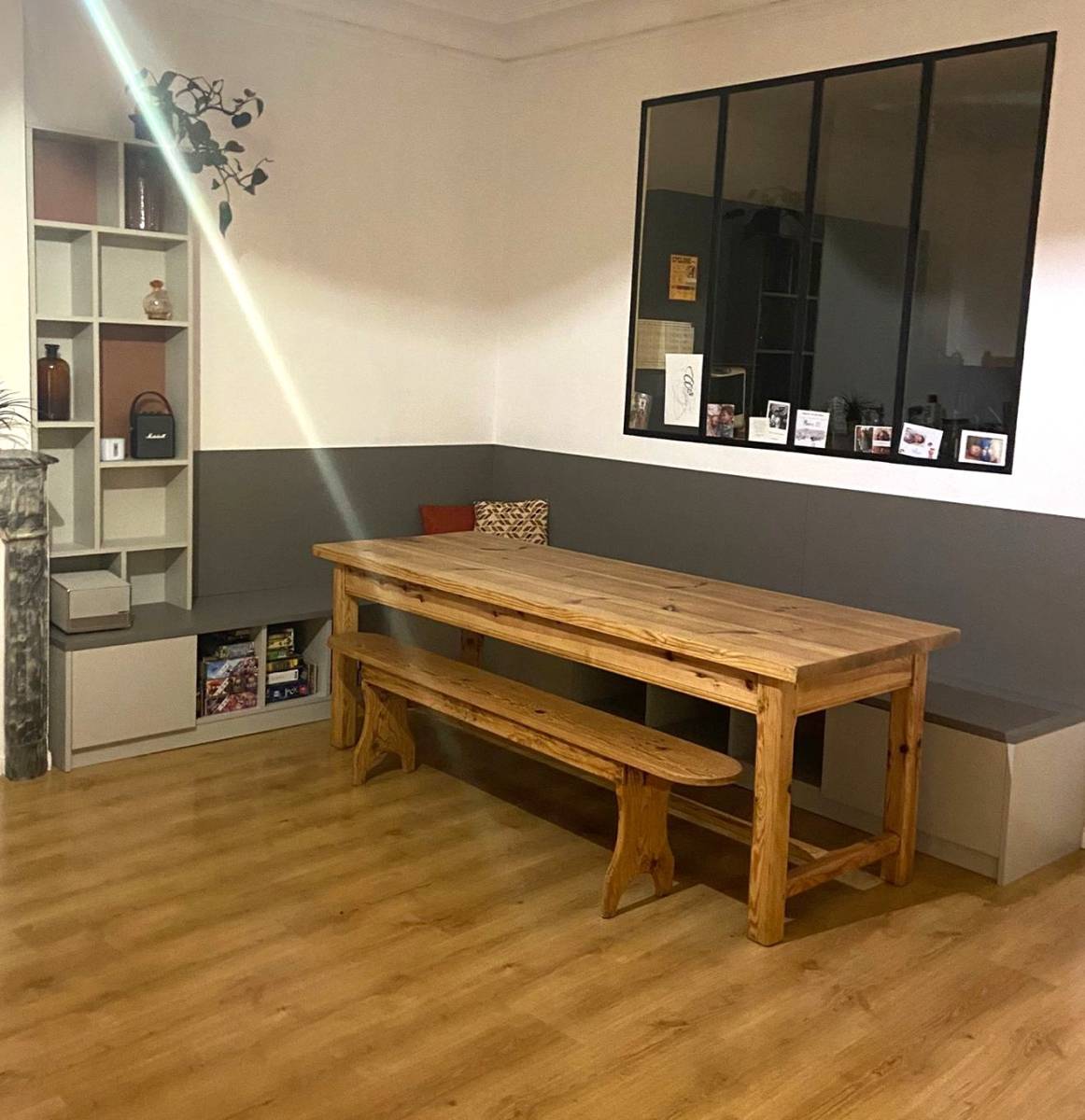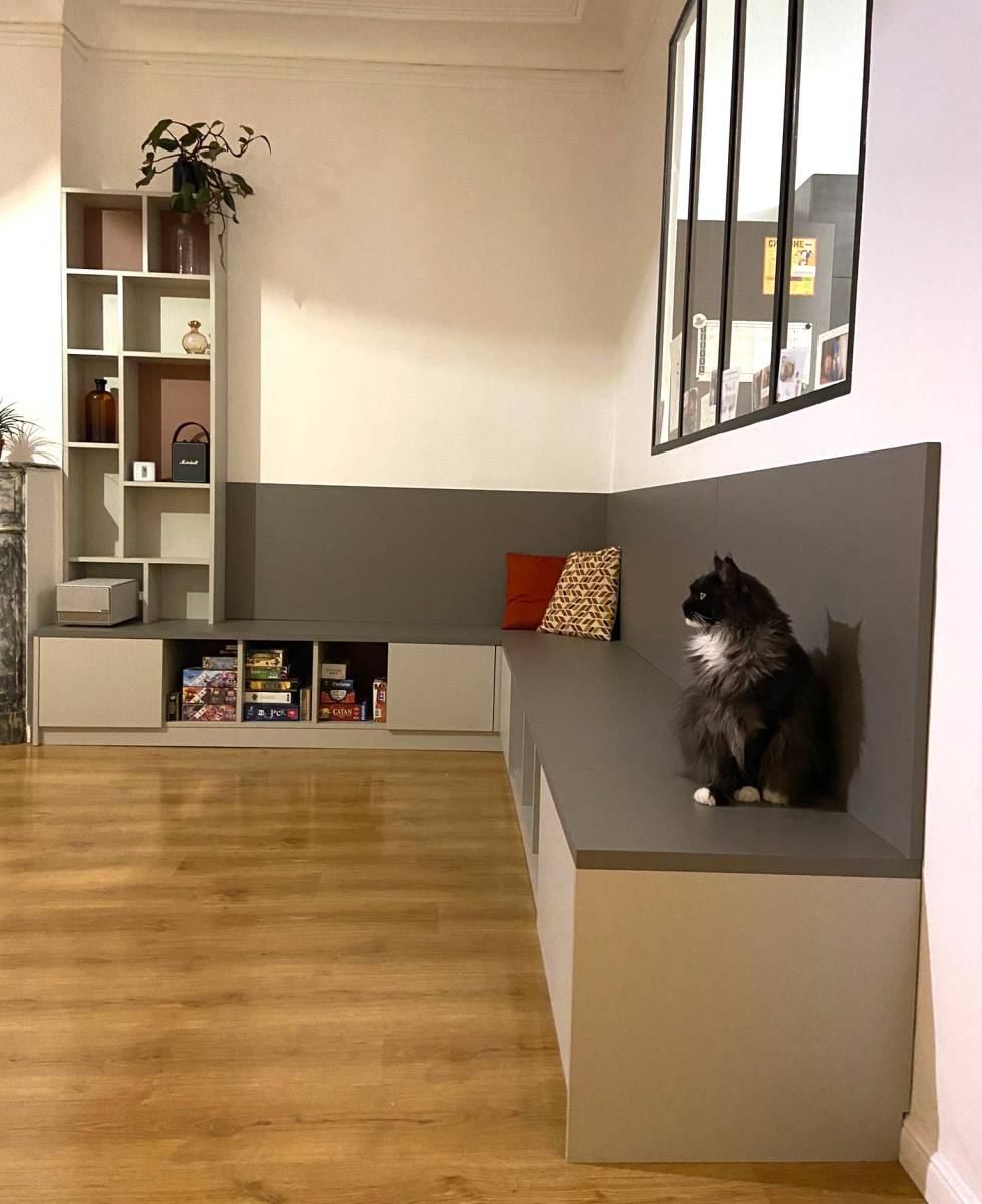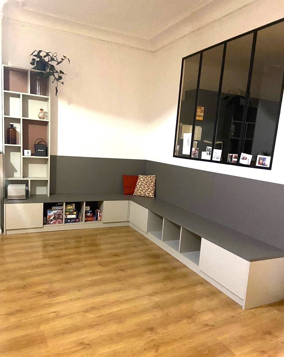 Nos clients veulent que un espace banquette pour s’assoir autour de leur table ainsi qu’un espace de rangement pour optimiser leur salle à manger. Ils souhaitent avoir un aménagement bibliothèque léger qui ne prend pas toute la hauteur du mur.