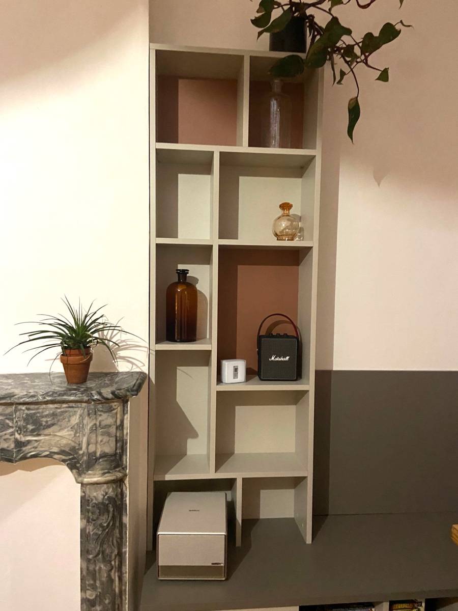· La bibliothèque est aménagée sur la partie gauche du L. Elle s’appuie sur le renfoncement de la cheminée et utilise la même profondeur que celle-ci. Elle sert d’élément de décoration, mais aussi à mettre en avant les objets et décorations que nos clients souhaitent mettre en avant.
