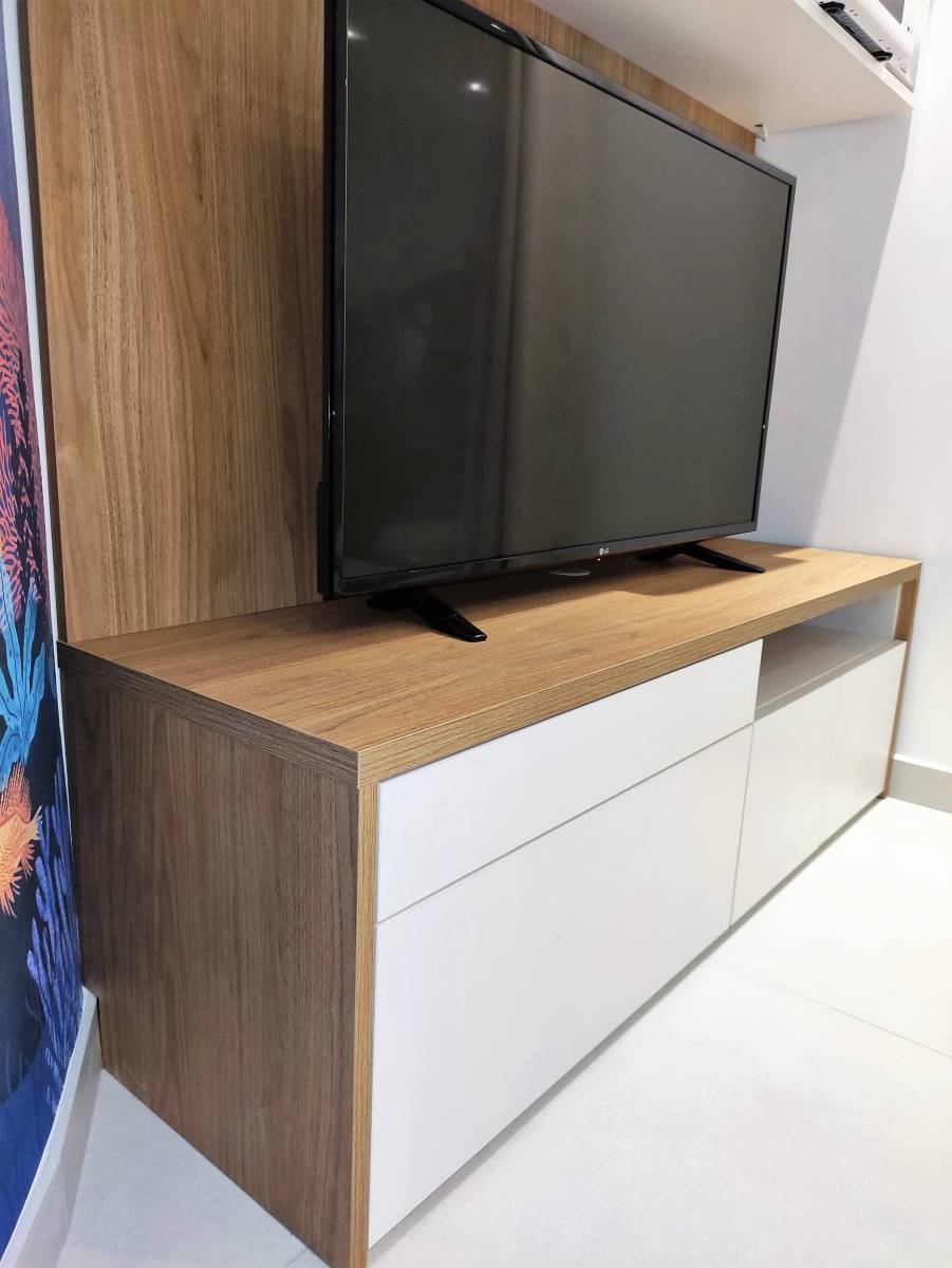 Pour réaliser ce meuble télé il était donc primordiale de respecter ces demandes. Néanmoins, l’accompagnement de notre équipe a été important dans le choix des couleurs, des épaisseurs et des matériaux. Nous avons proposé aux clients de rajouter un panneau couleur bois comme pour le dessus du meuble bas à l’arrière de la télé pour vraiment lier les deux meubles ensemble, mais aussi pour rajouter un effet cossu et chaleureux à ce meuble aux teintes claires.